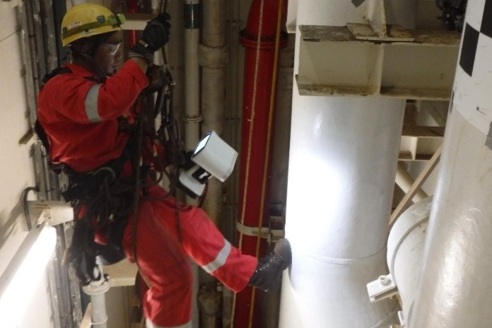 因为这根管道是垂直的,考虑到房间布局,没有站立空间让工作人员拿着手持式扫描仪操作。于是,有两名勇敢的团队成员掌握了绳索技术,经过安全扫描培训后,他们用长绳绑住,顺着管道往下降——一手握绳,一手握Leo。