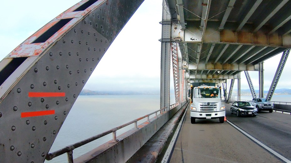 当谈到里士满-圣拉斐尔大桥的这些特殊钢板时,需要考虑几件事。首先,需要测量的部分离水面有185英尺(56米)。其次,全天川流不息的车辆。以及在海湾肆虐的狂风,和需要尽可能地减少干扰——例如,在鲸鱼交配的季节,限制任何近水活动,以免打扰鲸鱼的兴致。