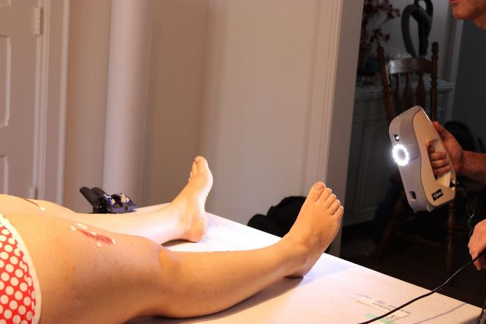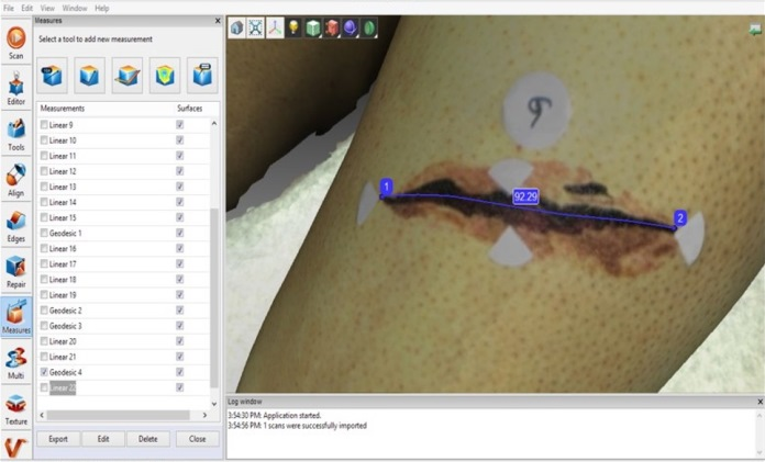 在使用Artec Eva的第二项测试中,整个流程明显流畅了许多。3D成像仪对参与者身体进行了多次扫描。Artec Studio的测地线工具对于伤口测量数据和曲度数据的记录帮助很大。测试中还使用了色彩地图来记录色彩。同时,在扫描过程中,计算机显示器输出了3D网格数据和点云信息,实时调整了视觉角度和定向。值得注意的是,生成的网格表面数据具有高清分辨率。Artec Studio软件为这些扫描文件提供了处理平台,它能够完成图像对齐融合工作,合成3D数字复制品。