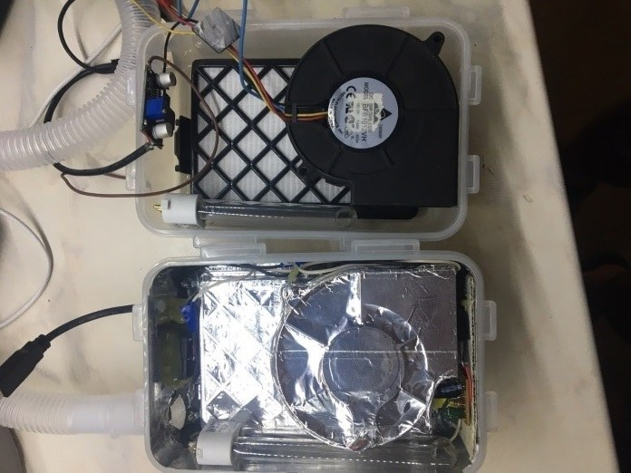 这一系统的主体部分装在塑料三明治盒里,由吸尘器滤网、紫外线灯、电脑风扇组成,紫外线灯杀灭病毒和细菌,电脑风扇将净化后的空气输送给佩戴者。内置可充电电池,搭配一个充电口。