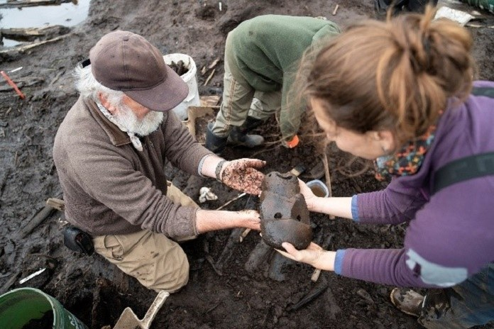Rick Knecht博士与Anna Mossolova博士研究员在Nunalleq小心翼翼地抬起出土草屋木板路边的一副面具。