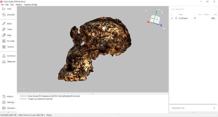 在Artec Studio中,Martin使用橡皮擦移除了背景,随后对齐扫描。之后,又进行了整体配准,再删除离群噪点,进行尖锐配准。对这些操作,他解释道:“如果是处理人类头骨,我希望能看清所有质量性状,所以精确度设为100微米。这样就能看到我想要的特征了,比如颞线、颅缝、小孔等。”