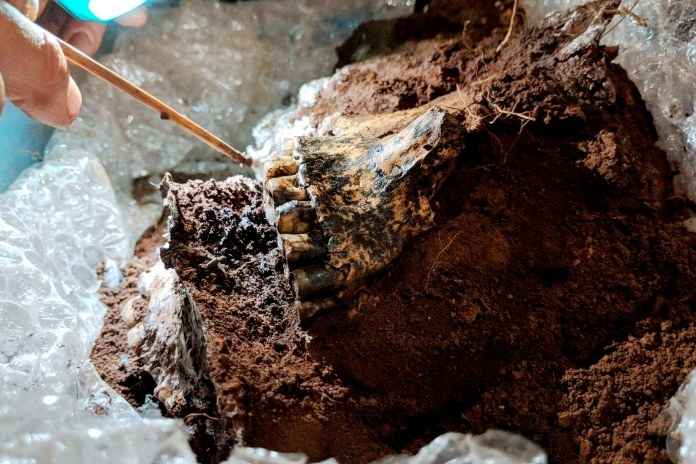 在Drimolen考古现场,Leece在共同负责人Stephanie Baker的帮助下,花了几天时间,小心翼翼地从地上割下镶嵌着化石的大块沉积物。搞定后,该Martin上场了,他用木棒等工具小心谨慎地从土壤里把头骨碎片分离出来。为防止标本散落,还涂上了文物修复胶,可以长期保证碎片不移动。