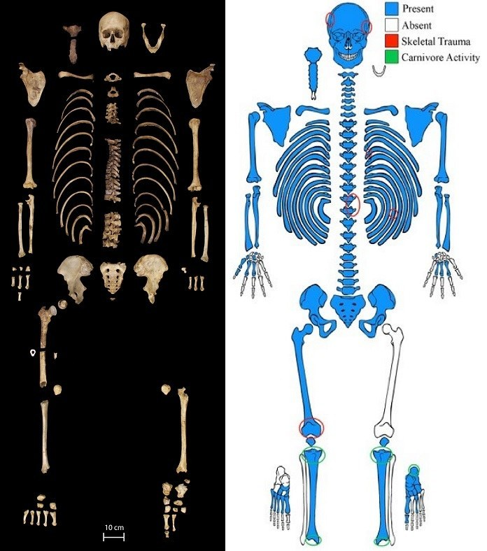 现场找到/未找到的骨骼,还带有创伤和食肉动物活动的痕迹