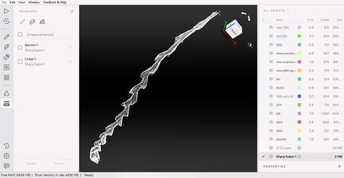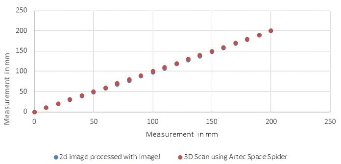 为了证实Artec Space Spider的精准度,Tubbs想到了标尺,用尼康D5000数码单反相机为其拍照。然后,他用ImageJ软件处理了照片,在20厘米长的标尺上对每一厘米作了标记。随后在扫描模型上重复该过程。