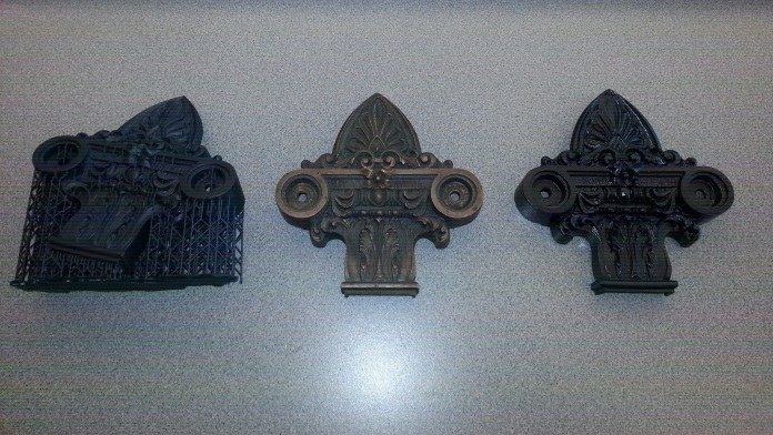 刚打印完、等待清洗的侧板(左)。原始铜侧板(中)。清洗完毕的全新侧板,采用SLA 3D打印技术(右)。