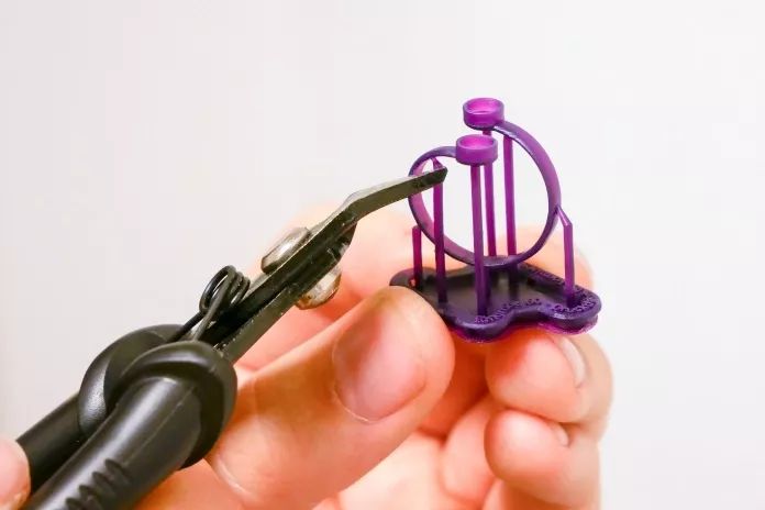全新工艺如下:客户在线选择预制设计的珠宝,设计师用专门的珠宝设计软件3Design制作成品模型。根据客户喜好,选中扫描好的基本款并优化,然后采用浇铸蜡树脂打印。蜡质模具随后被送到装有金属材料的浇注机上制作成形。