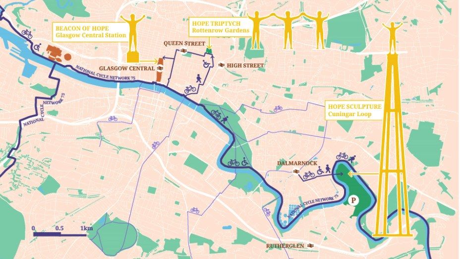 一条步行和骑行路线将这三座雕塑连接起来。图片来源:thehopesculpture.com
