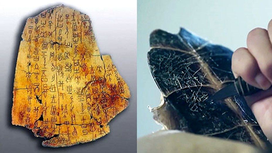早在公元前1400年的中国商王朝(如今河南安阳小屯殷墟)都城生活的王室成员使用龟甲兽骨记录占卜和重大事件──这些经过整治﹑钻凿﹑烧灼﹑刻辞的龟腹甲﹑背甲和肩胛骨载体,因文字契刻于其之上﹐故称甲骨文。