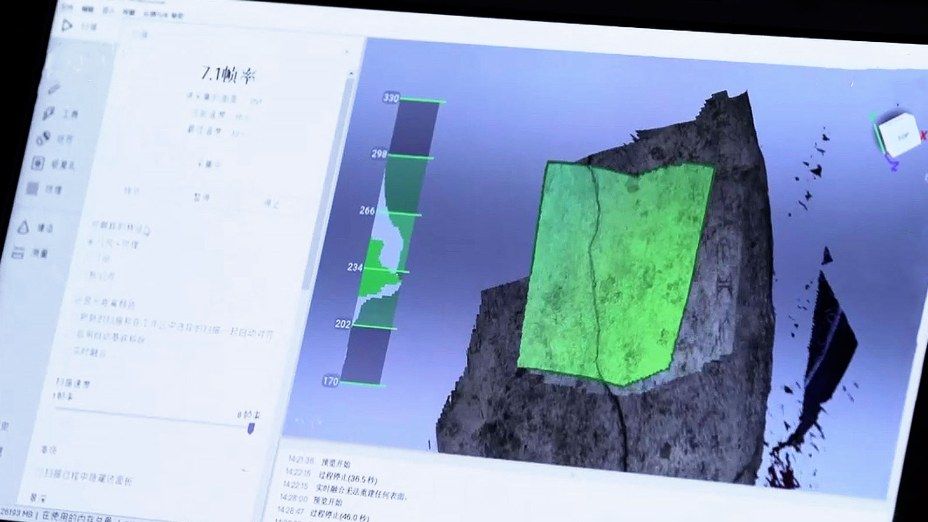 朝日三维使用Space Spider对准被扫描的骨片,无需贴标记点,保持离对象约20到30厘米的距离,一键开启工作。工程师顺着甲骨的表面来回移动设备,数据同时动态显示在电脑屏幕中。