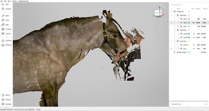 对齐后,Artec Studio的尖锐融合对该项目而言也相当关键。“有了尖锐融合,就能看清扫描中的一切,”她说道。“比如可以感受到皮毛的柔软,即便它们很短,还有马匹的肌肉等等一切。”