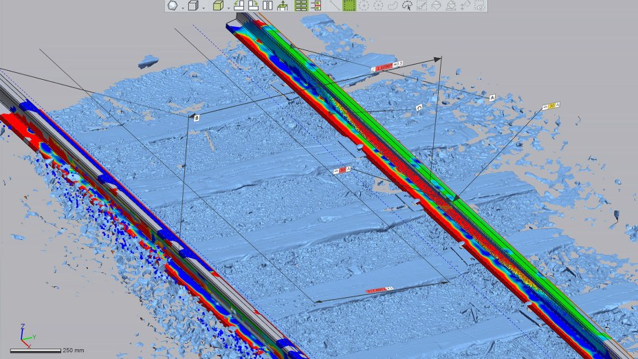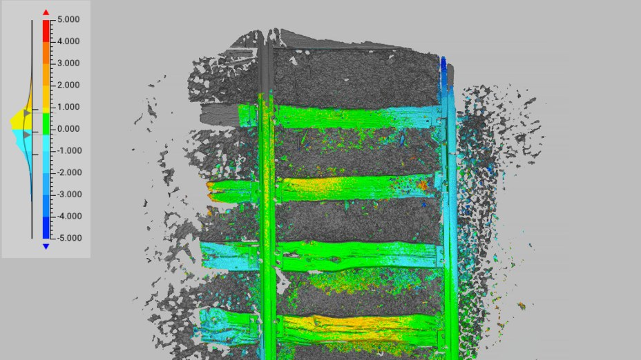 Artec Studio的表面距离映射比较了同一铁轨相隔数月(寒冷的冬天清晨与炎热的夏天)的两次扫描结果。