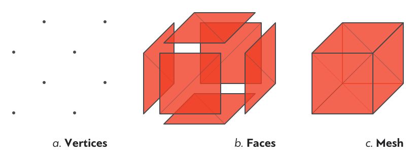 图5:三角网格(由三角形组成的多边形网格):(a)-顶点(b)-平面(c)-网格