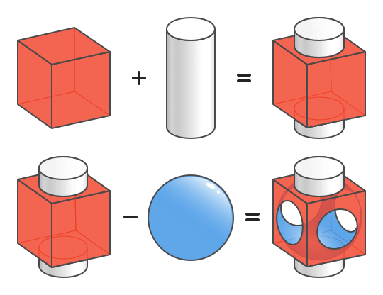 构造立体几何法(CSG)还有另一种方式,即采用体素(球体、椎体、立方体、圆环等)作为基本元素,在这些原始体素基础上,再通过布尔运算(图7)构建更高级的体素,即联合、相减、相交等。