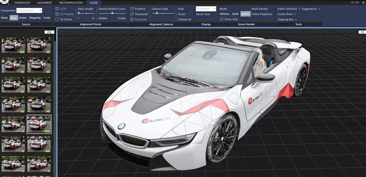 这款摄影测量软件本身不是3D扫描仪,但依然可以根据照片与/或激光扫描制作3D模型,用于虚拟现实、游戏、建筑、视觉特效。摄影测量的一大优势就是高分辨率和DPI的高级数字摄像头会带来出色的纹理。但模型几何有个缺陷,就是它不如专业3D扫描仪那样准确。此外,摄影测量解决方案需要用户掌握更多知识,安装和数据后期处理也需要更多精力。若想同时实现两者的优势,您可以结合摄影测量法的纹理和3D扫描仪几何数据,就像我们使用Artec Leo扫描了宝马