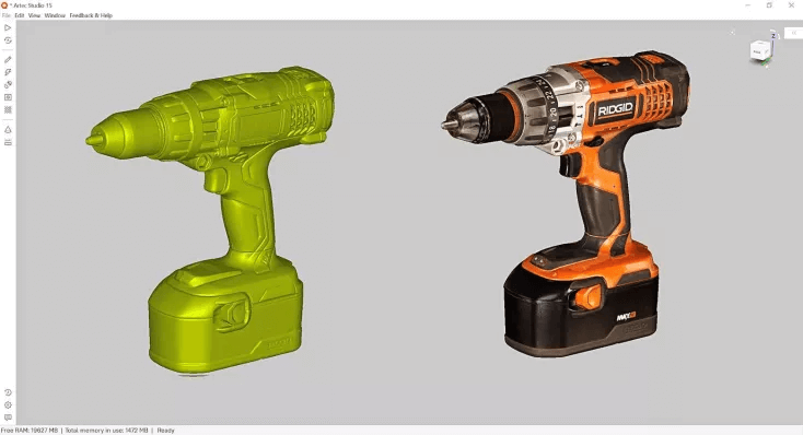 无纹理(左)和带纹理(右)的电钻3D扫描