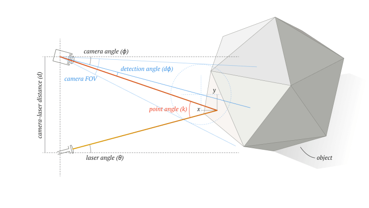 第三类激光扫描仪采用三角测量技术,激光发射后返回至机载相机图像传感器阵列上的某个特定位置。为计算物体与三维扫描仪之间的距离,设备采用三角测量法,因为激光源、传感器、物体上的标记构成一个三角形。激光源与传感器之间的距离、激光与传感器的角度都是非常精确的。激光反射回传感器后,系统可以测量其与传感器之间的角度,从而计算激光源到物体表面的距离。